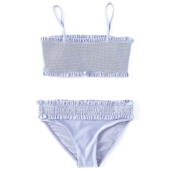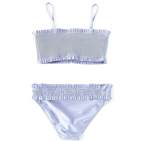 - smocked bandini top with square neckline, spaghetti straps, pullover styling, ruffle trimming, and removable padding